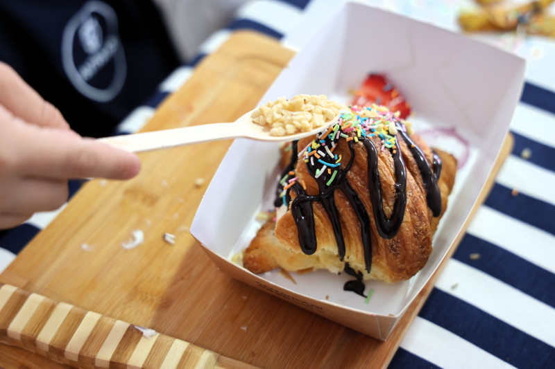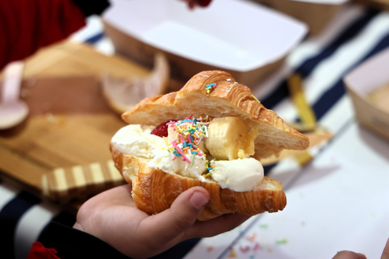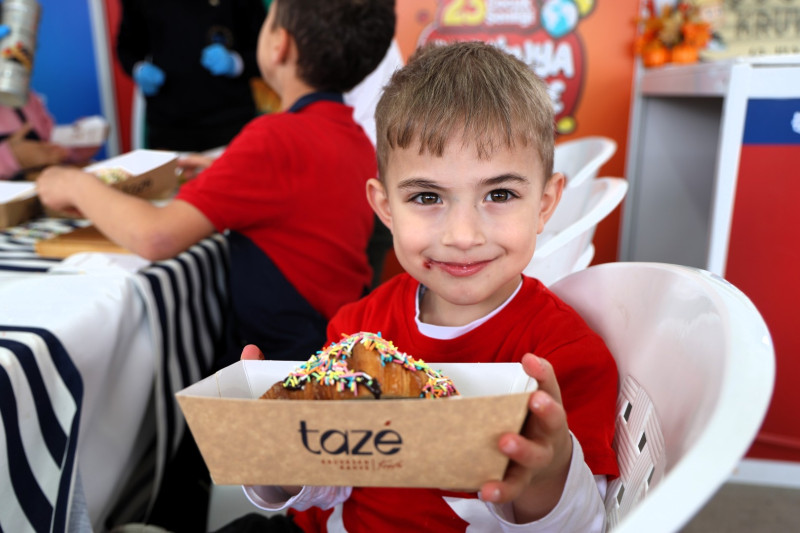 Çocuklar, atölyede hazır kruvasanları çikolata, meyve ve çeşitli renkli malzemelerle istedikleri gibi süsledi. Her çocuk kendi kruvasanını tasarlayarak eğlenceli ve renkli görüntülerin ortaya çıkmasına katkı sundu.