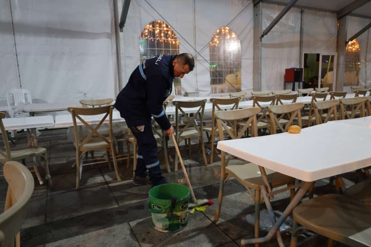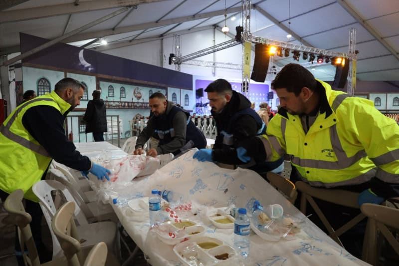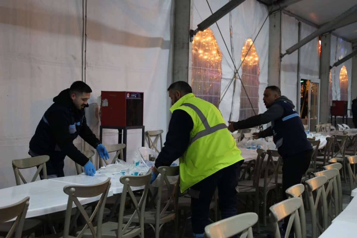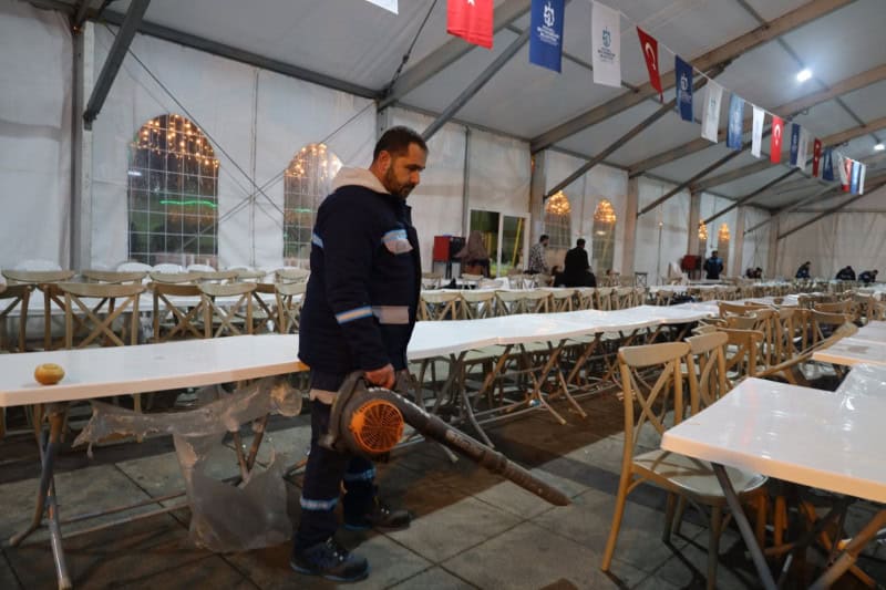 Her akşam iftar programının sona ermesiyle birlikte temizlik ekipleri vakit kaybetmeden çalışmaya başlıyor. Masalardaki yemek artıkları toplanıyor, çöpler ayrıştırılarak atılıyor, masa ve sandalyeler düzenleniyor. Çadırın içi ve çevresi detaylı şekilde temizleniyor, alan bir sonraki gün için hazırlanıyor.