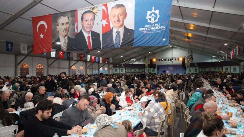 Kocaeli Büyükşehir Belediyesi tarafından İzmit Kent Meydanı’nda kurulan Ramazan Çadırı, her gün yaklaşık 1.500 vatandaşı aynı sofrada buluşturuyor. Yoğun ilgi gören iftarlarda, çadırın dışına da ek sofralar kurularak herkesin rahatça iftar yapması sağlanıyor.