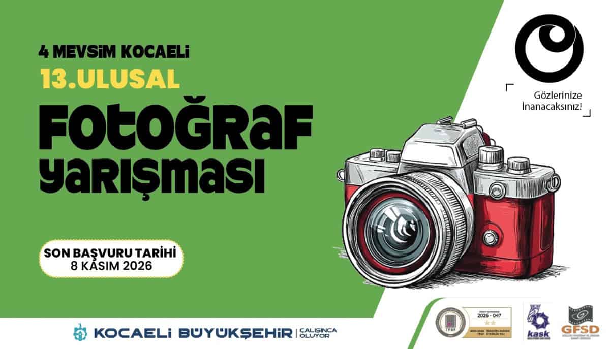 Kocaeli Büyükşehir Belediyesi tarafından düzenlenen ve bu yıl 13’üncüsü gerçekleştirilecek 4 Mevsim Kocaeli Ulusal Fotoğraf Yarışması için başvurular açıldı. Fotoğrafçılar, Kocaeli’nin doğal, kültürel ve görsel zenginliklerini kadrajlarına yansıtmak için 8 Kasım 2026’ya kadar başvuruda bulunabilecekler.