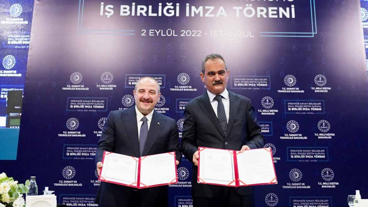 Millî Eğitim Bakanlığı ile Sanayi ve Teknoloji Bakanlığı arasındaki Organize Sanayi Bölgelerinde Okul Öncesi Eğitim Kurumu Açılmasına İlişkin İş Birliği Protokolü, Millî Eğitim Bakanı Mahmut Özer ile Sanayi ve Teknoloji Bakanı Mustafa Varank tarafından imzalandı.