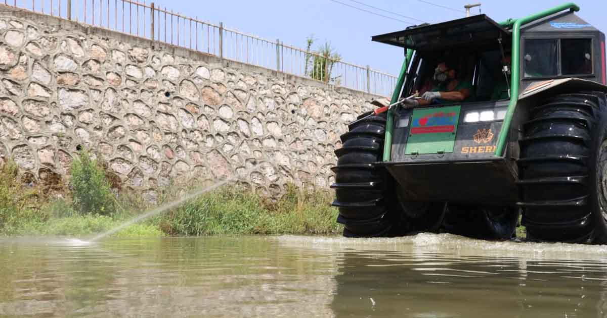 Kocaeli Büyükşehir’in vektörle mücadelede kullandığı hem karada hem denizde hareket kabiliyetine sahip araçla 3 günlük ilaçlama yarım günde tamamlanıyor Kocaeli Büyükşehir Belediyesi...